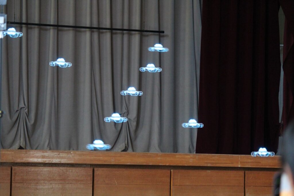 ドローンショーのパフォーマンス。遠隔操作で動く9機のドローンが、曲に合わせて動きます。